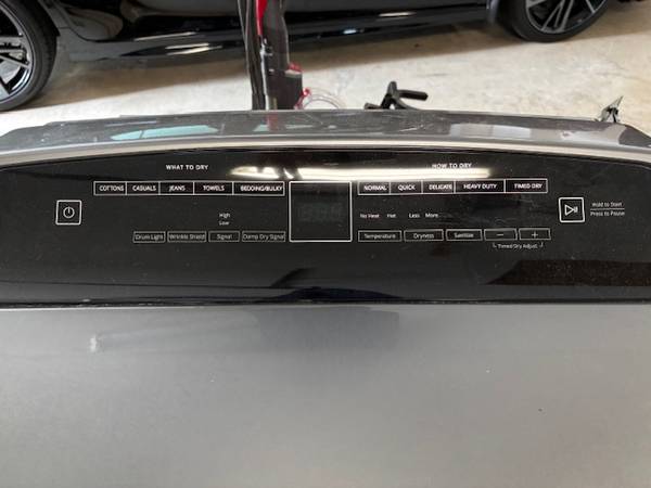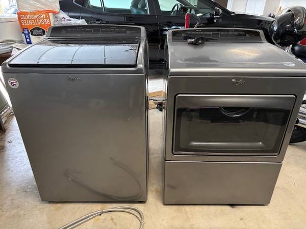 Whirlpool washer/dryer set. Dryer has new kit installed to include pulley, belt and drum wheels. The heating element was replaced four months ago. The washer works but not consistently in deep fill mode. I have a new part (water supply element $76)) that is easy to install. Washer comes with metal hoses and drain line. Dryer has sneaker rack included.