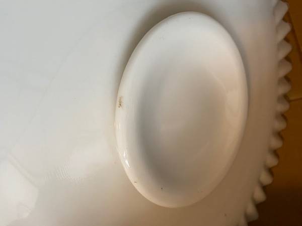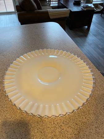 Large White Glass Fluted Edge Platter: 15 " around and 1" high. White with clear edges. In perfect condition expect for a small nick on the bottom. This item is for pick-up and cash only.