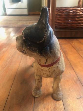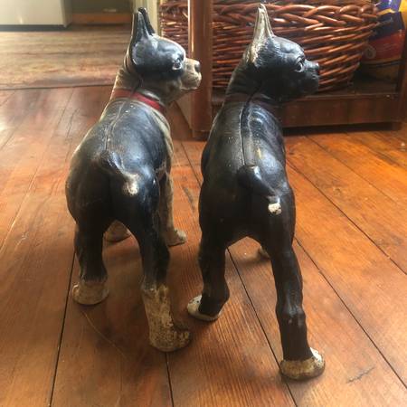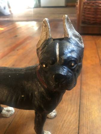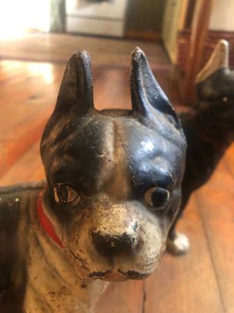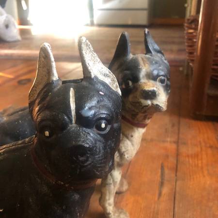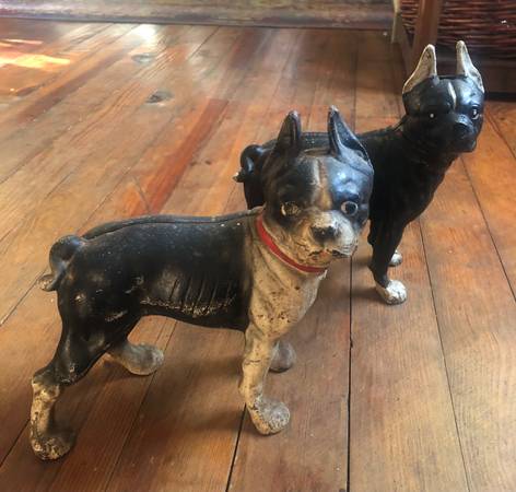 Two Hubley Cast Iron Boston Terriers or Boston Bull terrier to be proper for the time. Black was is 200; Black and grey one is older; circa 1900 and is $400; both approximately 10" by 10" and around...