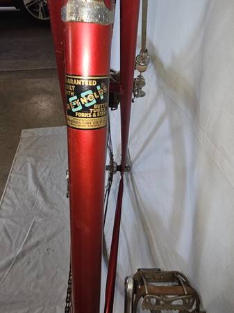 Mid 1970s Cresent made in Sweden. 23-1/2” frame. Repainted. The frame is all 531 Reynolds steel tubes, double butted main tubes, stays, fork, with fancy lugs. Shimano Dura-Ace crankset (42-52, 170 mm arms), side pull brakes, front derailleur, except Campagnolo Nuovo Record rear derailleur and downtube shifters. Fiame Yellow label tubular rims with high flange Campagnolo Nuovo Record 36-spoke hubs. Laprade fluted seat post. Suntour Superbe headset. TTT Mod Grand Prix handlebars and stem. Avocet Racing I saddle.