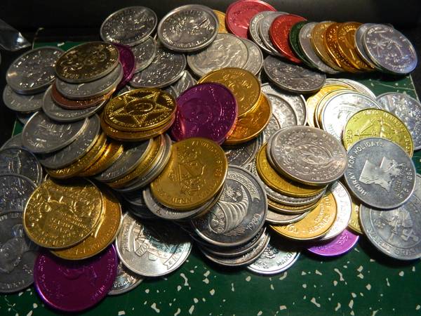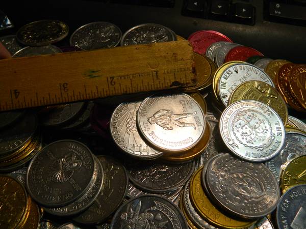 There is a around 110-115 tokens. Most appears to be uncirculated and in excellent condition. I believe they are all aluminum. At a quick glance, they seems to be from the 60s, 70s and 80s. Quick check and they seem to sell on ebay from $1-10 per coin. They are approx. the size of an old style U.S. silver dollar.