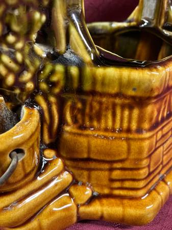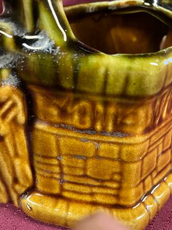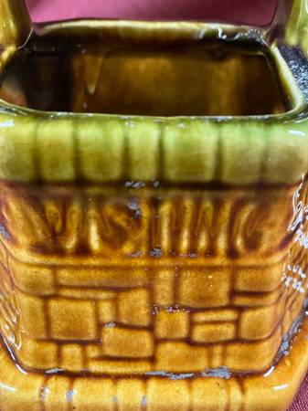 YOU MAY HAVE A LITTLE CLEAN UP WHEN YOU GET IT HOME BUT OTHER THAN THAT NO CHIPS CRACKS OR CRAZING. IT HAS WORDS UNDER GREEN RIM. SOME ARE HARD TO MAKE OUT. I KNOW WISHING AND WELL BUT NOT SURE ABOUT OTHERS.