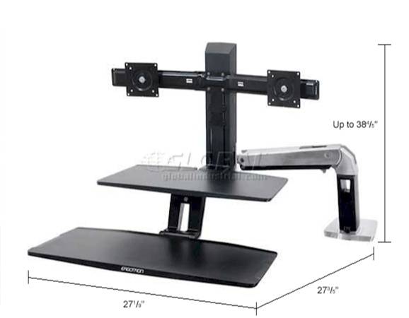 Allows you to mount two monitors and one keyboard and have it desk or standing height while working