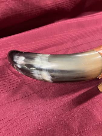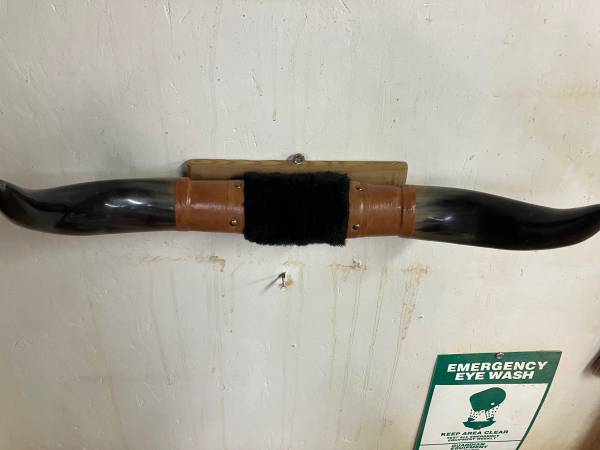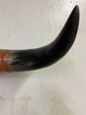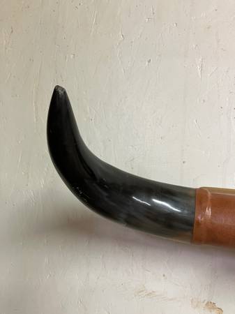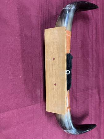 NOT EXACTLY SURE WHAT KIND OF BOVINE TGEY ARE FROM. THEY APPEAR TO HAVE BEEN MOUNTED PROFESSIONALLY OR BY SOMEONE WHO KNOWS WHAT THEY ARE DOING. I GOT THEM TO PUT A BETTER PLAQUE BEHIND BUT WAS AFRAID I WOULD MESS THEM UP.