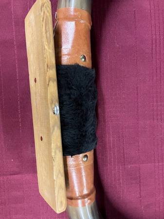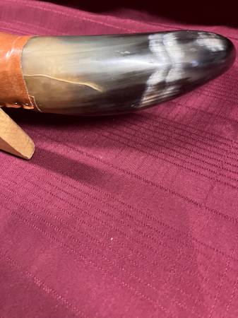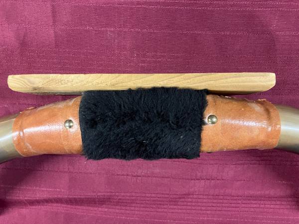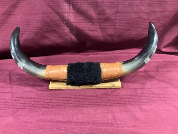 FAUX FUR IN CENTER WITH FAUX LEATHER TACKED ON AT FUR. THE HORNS DO HAVE A COUPLE SCRATCHES IN THEM THAT IM SURE CAN BE TOUCHED UP WITH A SHARPIE.