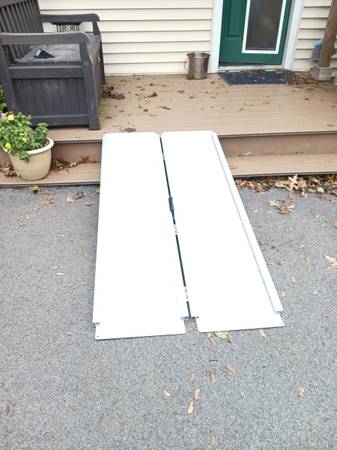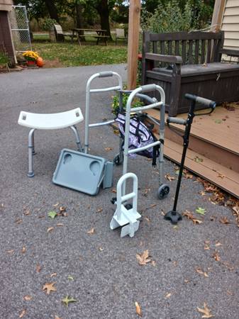 Aluminum Wheelchair Ramp, 5’ x 29” – 10 Rise ($135), Walker ($10), Walker Tray Table ($10), Walker Bag – Purple Flower ($8.00), Bath Bench ($35), Bath Tub Handle Grab Bar ($35), Commode Chair ($15), Cane with quad base (feet) ($5). Make offer for all or individually.