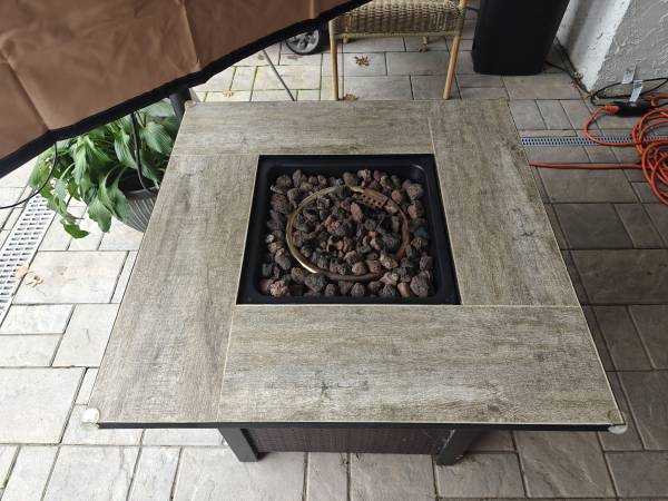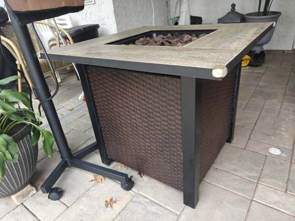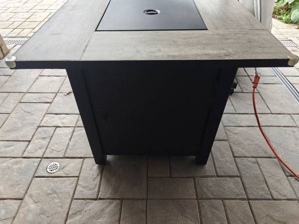 For sale...Yangming Propane Fire Pit Table, 30 Inch 50,000 BTU Square Outdoor Gas Firepit. Purchased from Amazon for $180 in 2022. Probably used it five or six times. Had a little bit of rust on the metal table edge. I sanded that and touched it up with some black paint. Overall and very good condition and works perfectly with a propane tank. Includes cover. Propane tank not included but will be temporarily connected so you can test it out if needed.