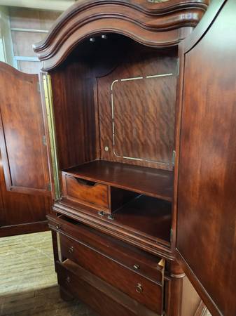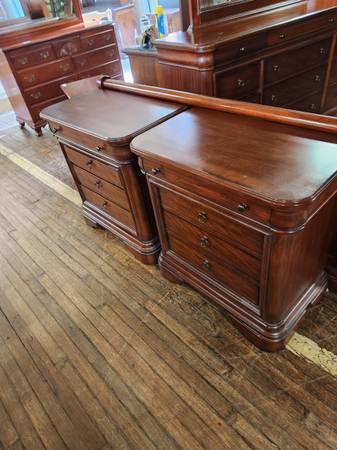 Very nice condition. Set includes dresser with mirror. 2 pc wardrobe. Pair of nite stands. Queen size bed complete with side rails and center supports. Located at DeLongs furniture 338 main Street...