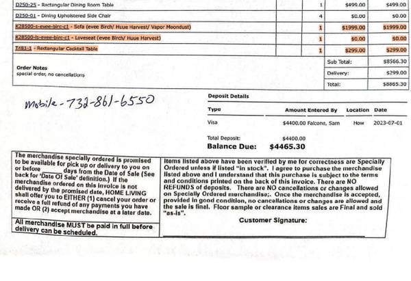 All items have **never been used**. The **sofa and loveseat still have the original tags on them**. **Receipt/invoice is attached**.