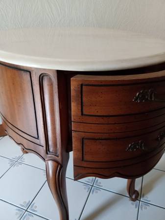 Weiman Furniture marble top oval end table. Vintage 1970s. Has one deep drawer.