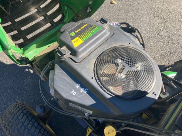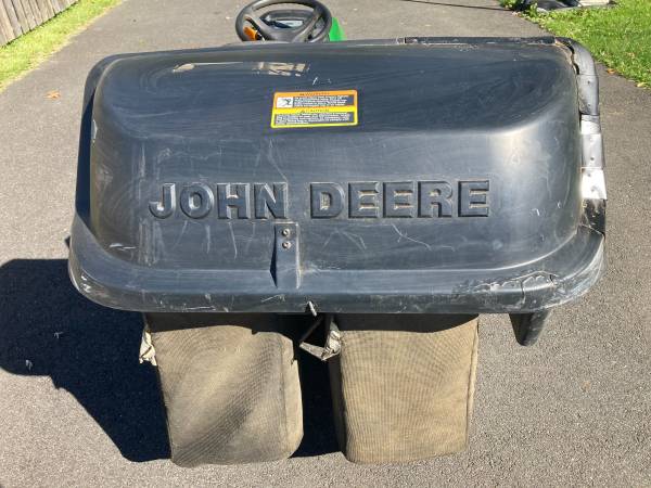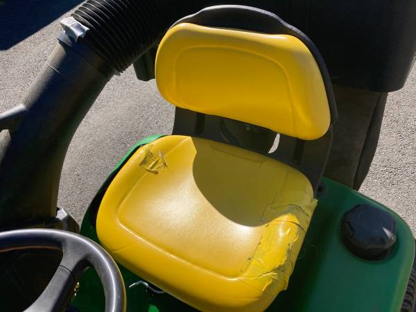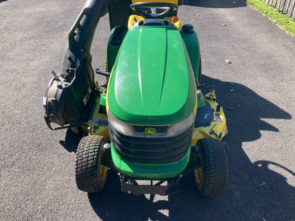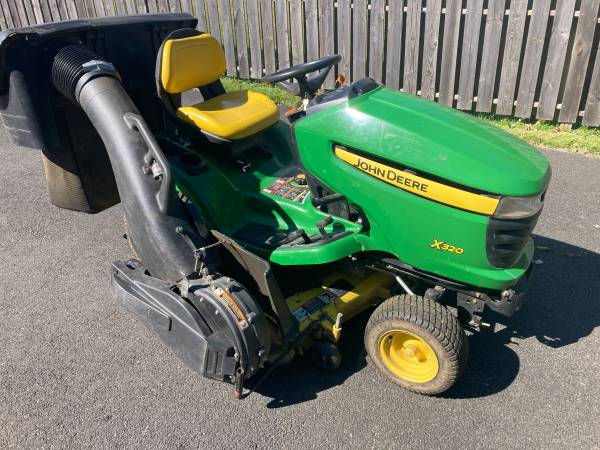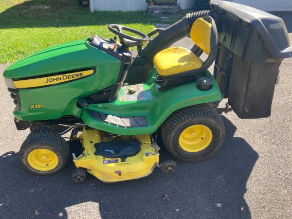John Deere X320 riding mower in good working condition. This has a 22 hp V twin Kawasaki engine, 48 inch deck, and foot pedal operated hydrostatic drive. Comes with a power flow bagger setup. 581 hours on the clock. Ready to work.