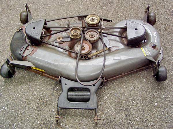 This is a good used mower deck belts are all good It does have some paint peeling at some spots but it has no rust holes in it or broken mounting brackets