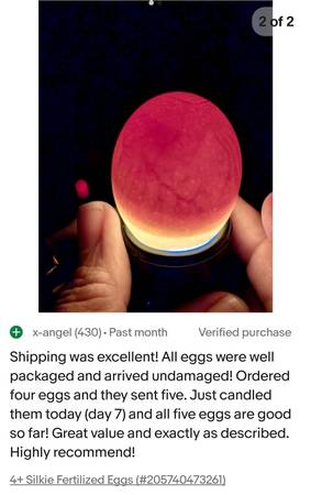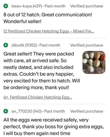 High Fertility Rate of 95%+! I can not guarantee hatch rate due to shipping and your incubator. No Refunds, I try to send extra eggs in case of any damages during shipping to ensure you get the amount of eggs your looking for!