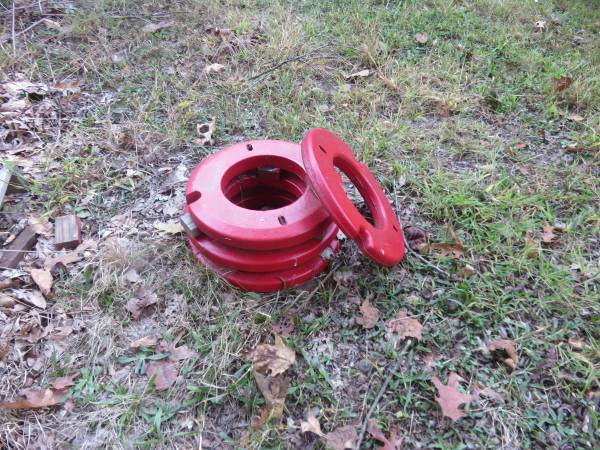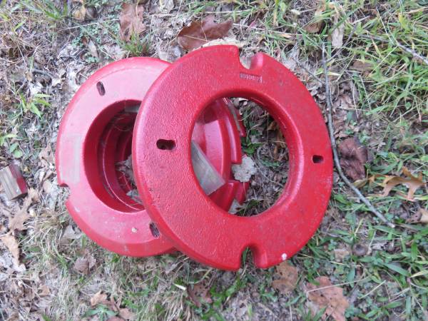 Pair Of David Bradley Wheel Weights # 1619M1 In Casting. Approximate 14 1/2 inches round Slot hole is 1-1/8 inches long. No weld, chips, cracks or repair. Wheel weights approximate weigh in at 38...