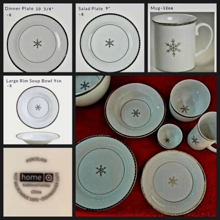 47 piece Christmas dinnerware service for 8. Includes 1 gravy boat, 1 serving platter, 2 serving bowls, 8 place settings, 7 cereal bowls and 4 sauce dip bowls, etc. Porcelain, not microwave safe, but dishwasher safe.