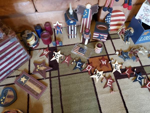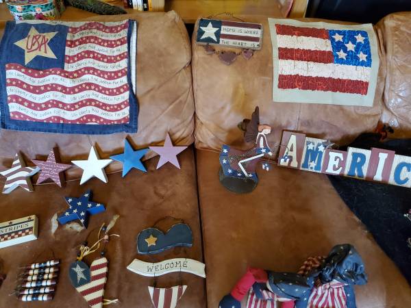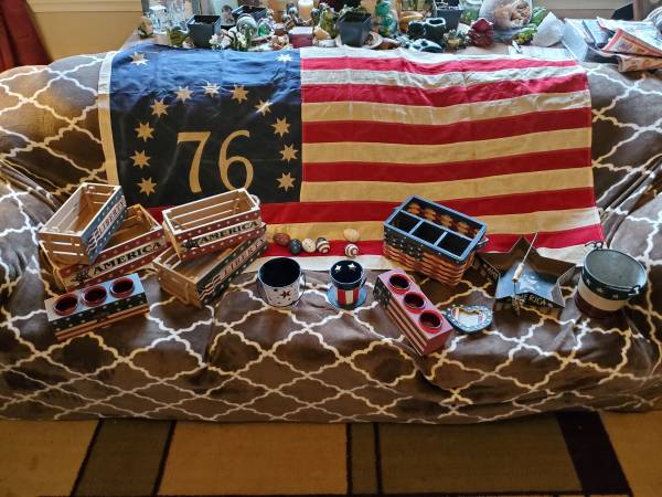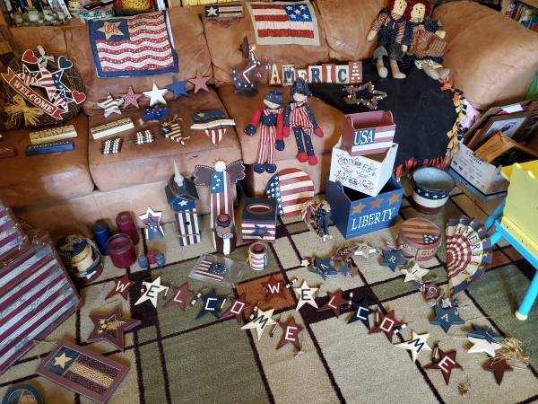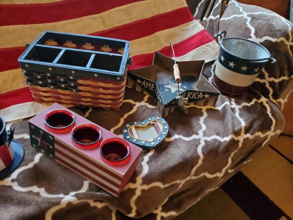 Approximately 50 Americana themed items used to decorate the kitchen and dining room. Including nested trunks, metal wall hangings, baskets, wooden boxes, dolls, signs, a US Flag with 76 in blue field and 13 stars, and more.