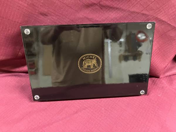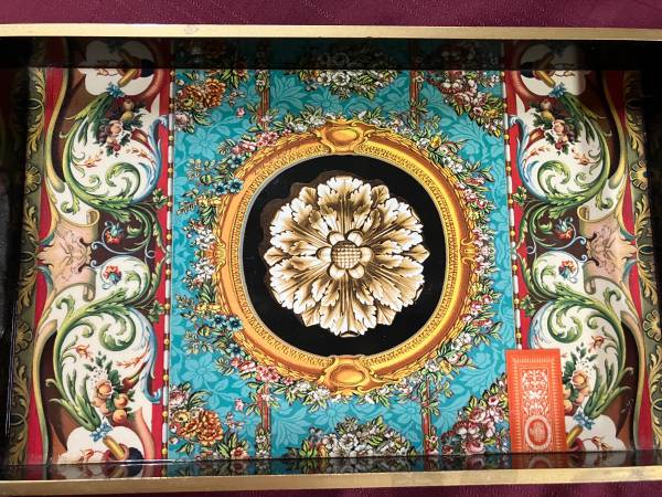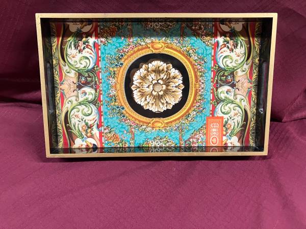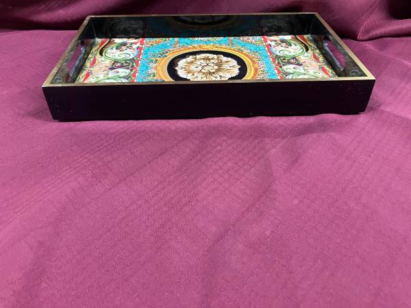 1 1/2” HIGH. IT IS PAINTED BLACK WITH DESIGN INSIDE TRAY WITH HIGH GLOSS TOP COAT. IT HAS A COUPLE TINY SCRATCHES. BUT IN VERY NICE CONDITION.