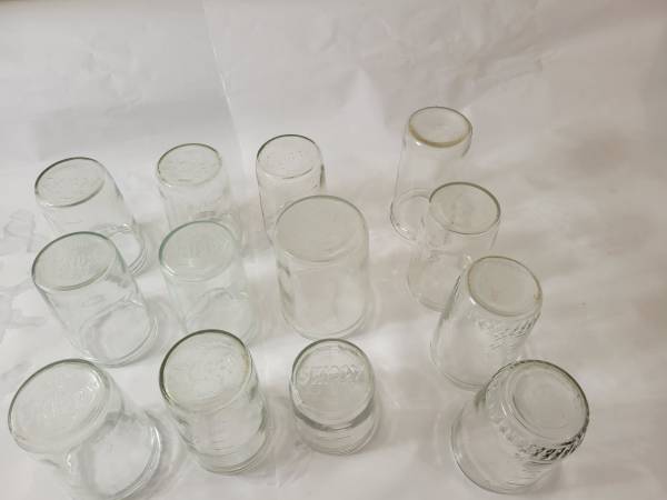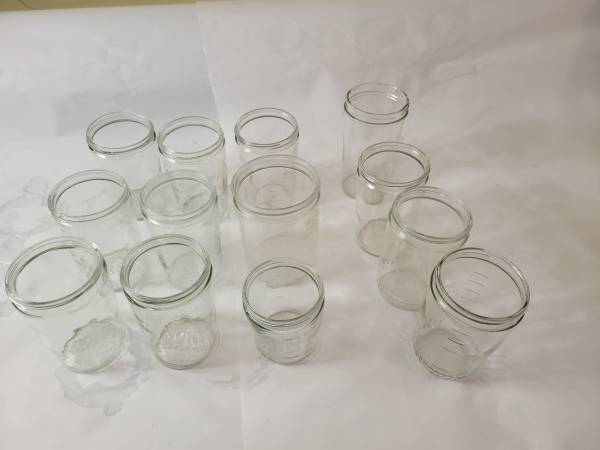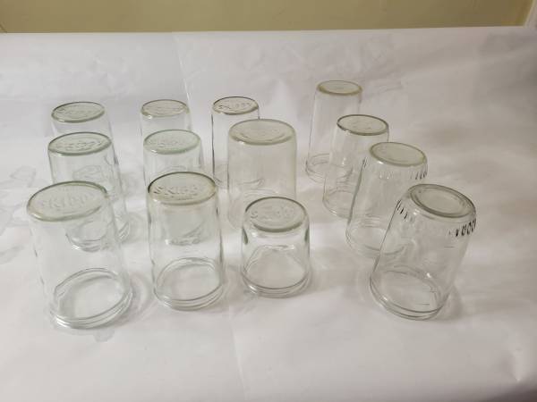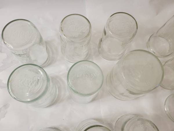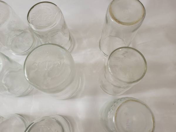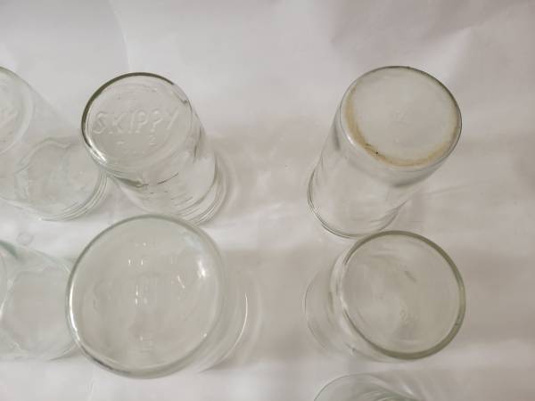 Lot of 13 Varies Sizes - 8 Wide Mouth Vintage Skippy Jars - 1 Very Wide Mouth Vintage Skippy Jar - 4 Other Misc Jars - Wide Mouth Some jars show some clouding and standard wear. Lot of 13