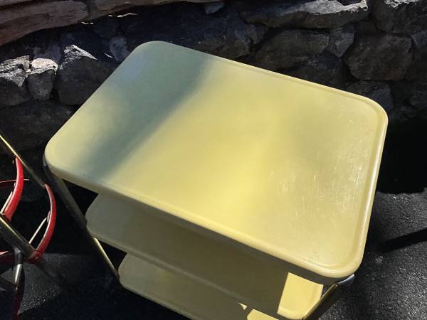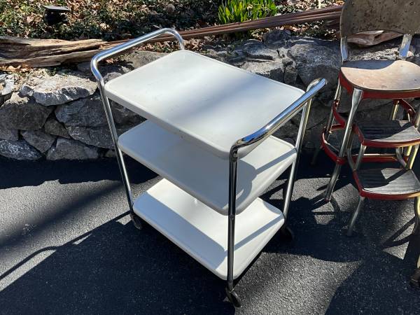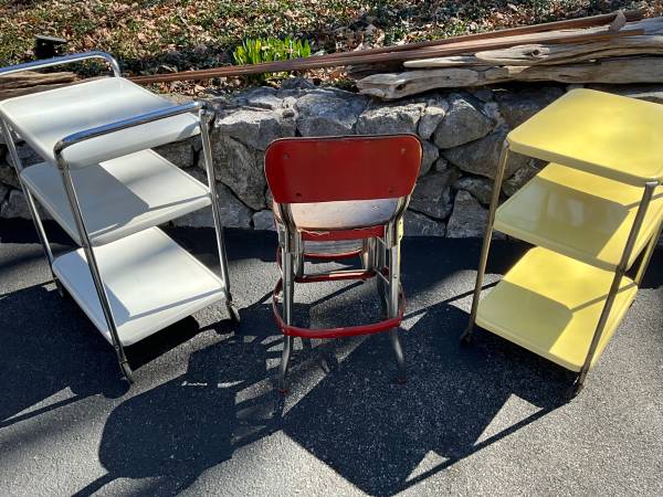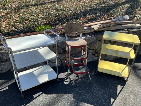 Costco / Mid - century rolling kitchen carts…… and …… high chair / step stool Yellow cart - $ 25.00. can be used for a plant stand White cart - $ 40.00. with chrome handles …used as a kitchen /...