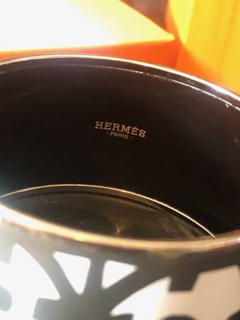 Authentic Hermes wide cuff bracelet, box and pouch, silver & white enamel palladium plated PM size “petite”; wide type at 1.5" high with a 2.5' diameter. Very good condition with original pouch and box. This pattern is circa 2019 and no longer made by Hermes.
