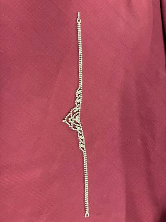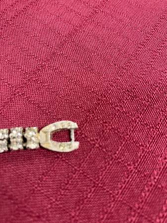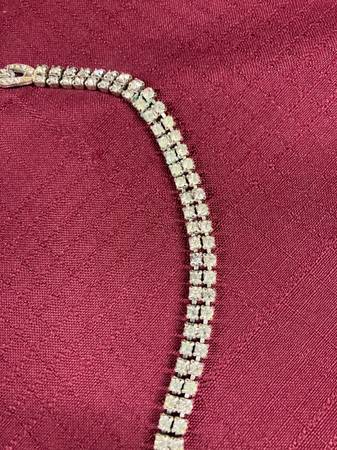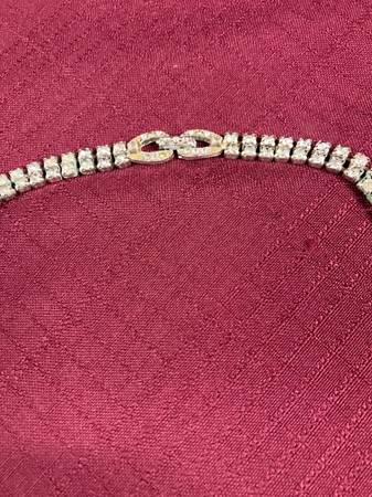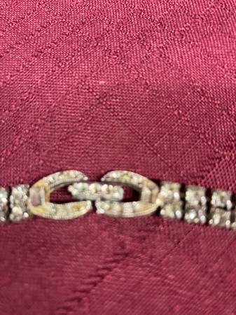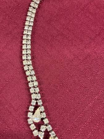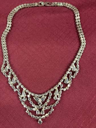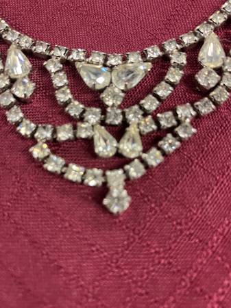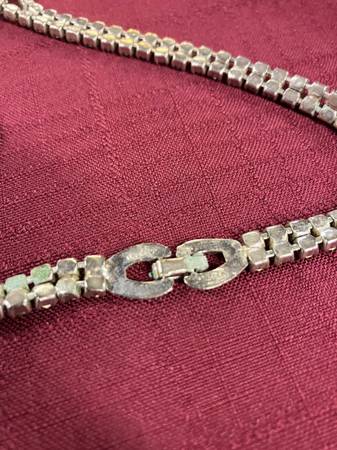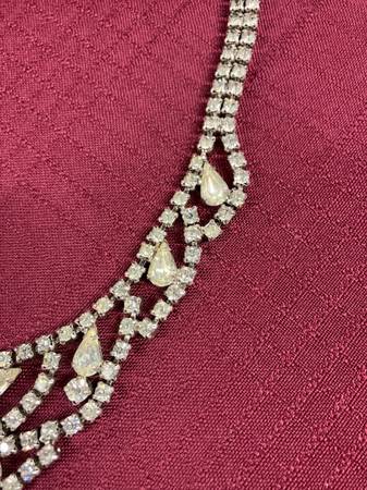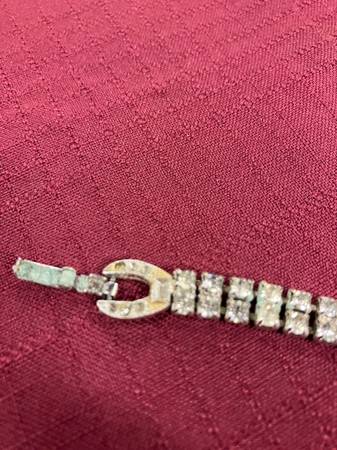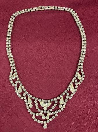 THIS BEAUTIFUL RHINESTONE DROP NECKLACE IS SIGNED ON BOTH HORSESHOE PORTIONS OF THE CLOSURE. ITS A LITTLE HARD TO SEE IN PICS. IM SURE IT COUKD USE A GOOD CLEANING. UNFORTUNATELY THERE ARE ONLY 2 STONES REMAINING FROM THE CLOSURE PORTION. SORRY! THERE ARE NO MISSING STONES IN THE NECKLACE PORTIONS.