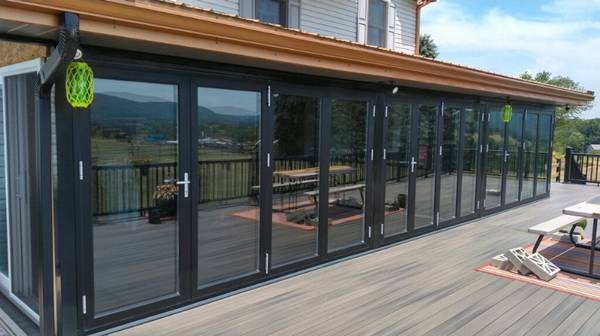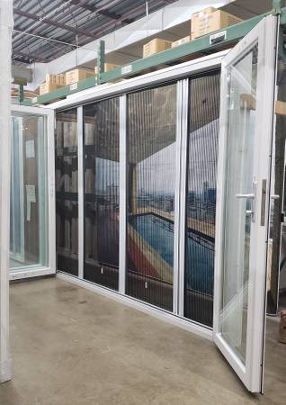 Unique and well-built folding patio doors in a variety of sizes, while supplies last. Aluminum construction and 5 mm double-paned, tempered glass offer durability. Argon gas for efficiency. Retractable screen sold separately and limited in number available. Sizes and pricing below. First come, first served.