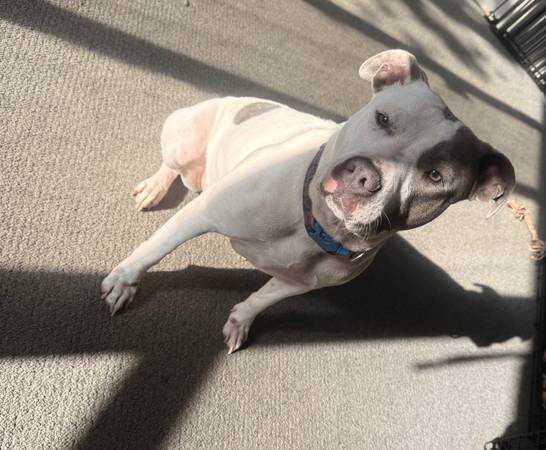 Her name is Luna she is a pitbull. She is a very friendly loving dog. She is not aggressive by any means. She is good with cat’s, other dogs and rabbits. She has been fixed as of this year, she just turned 2 years old in September. We just want her to go to a good home that she will be loved. She is on Blue Buffalo food, she does get small hot spots that just affects her front paws. We’ve had her on allergy treats that have helped with that. We are asking for a rehoming fee of $250.