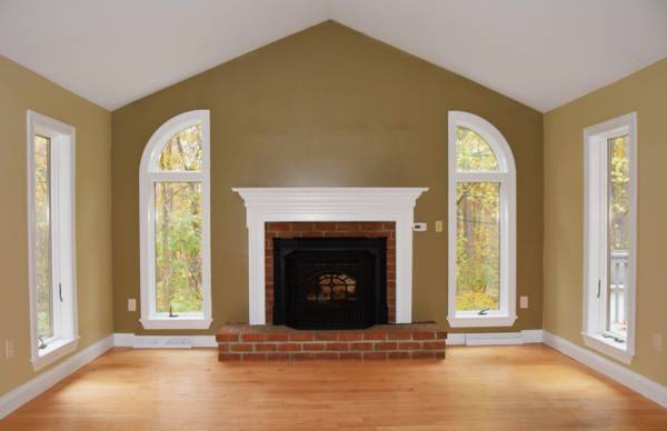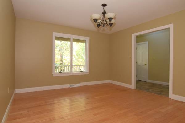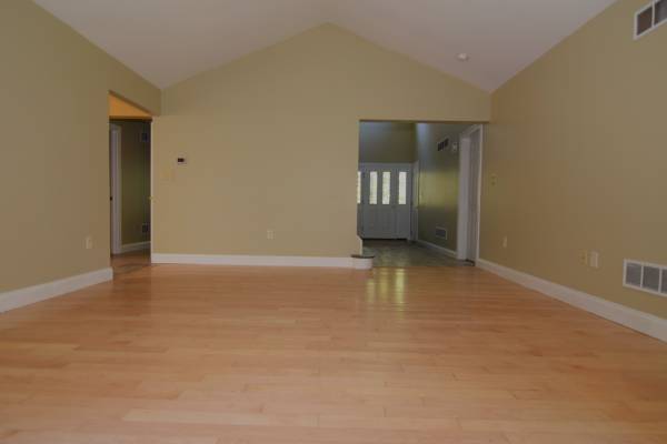 The great room serves as the centerpiece of the home with soaring vaulted ceilings, gleaming hardwood floors, and a thermostat-controlled wood pellet insert fireplace that adds both warmth and efficiency. Expansive rear windows invite abundant natural light and showcase picturesque views of the wooded landscape—perfect for enjoying nature and spotting local wildlife year-round.