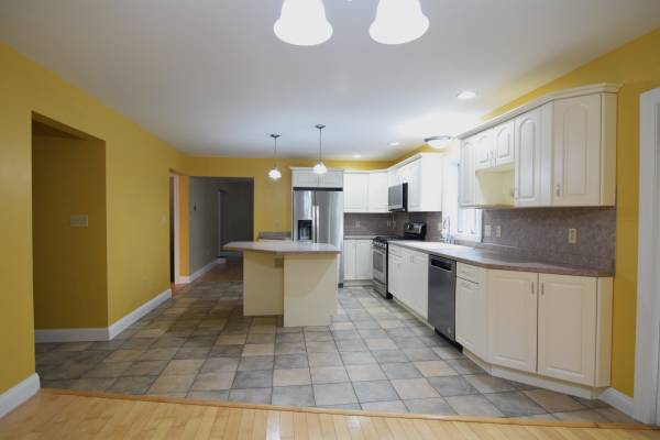 The kitchen combines modern design with practicality, featuring stainless-steel appliances, contemporary cabinetry, ceramic-tile flooring, and a center island with seating for 3–4. The adjoining breakfast area provides a cheerful space for everyday dining and opens directly to the backyard for easy outdoor access and entertaining.