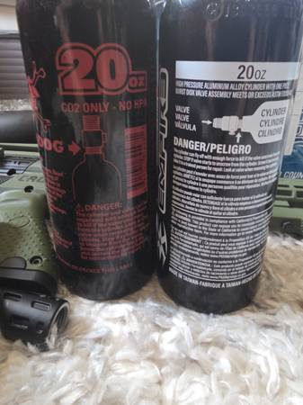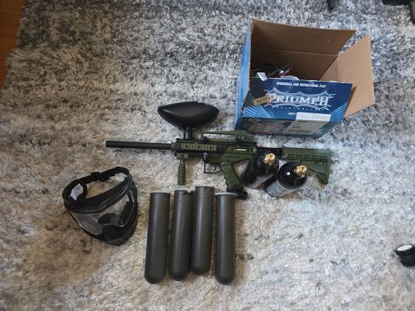 1 paintball marker, 2 20z co2 canisters, 4 paintball pods, 1 protective mask, 2 and a half bags of blue paintballs. The paintball gun alone is worth 150