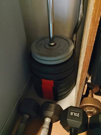8 10 lb plates equaling 80 lbs. A straight bar and a EZ curl bar. Must pick up in Pottsville.