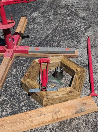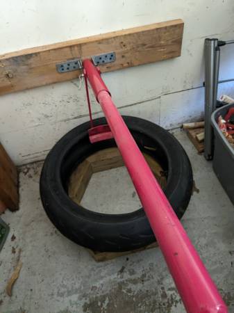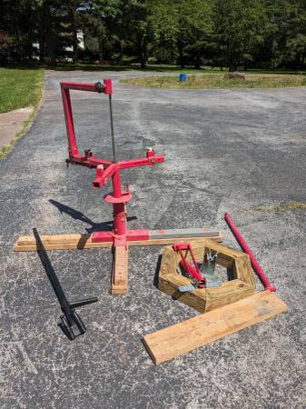 Modified Harbor Freight Motorcycle Changer. Includes upgraded poly rim holders to avoid scratching rims. The height of the changer has been lowered about 8 inches which greatly improves the leverage to more easily remove and mount tires. The bead breaker has been removed, but is included with the original HF breaker, red bar and wooden mounting stud you can mount in your garage or basement. A custom 4X4 wooden ring is also included which allows you to place the wheels on the ring during the bead break process without damaging wheels or rotors. This also includes an original NoMar mount/demount bar with spare parts as well. This bar is $130 plus shipping alone. Wooden leg extenders are also included to give you more leverage and more easily mount to a skid or other surface. Everything in photos is included.