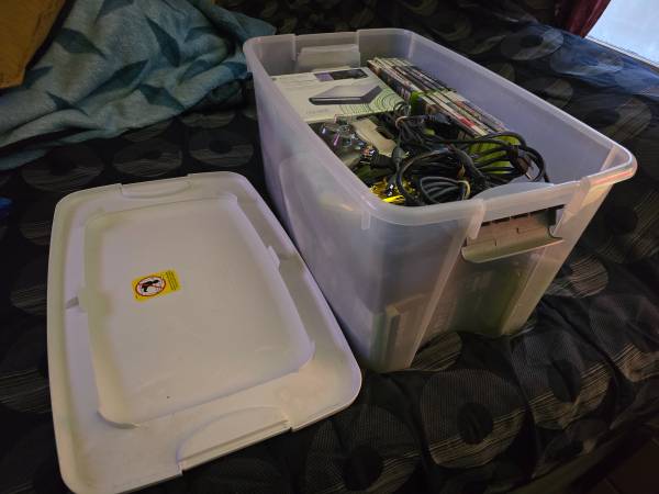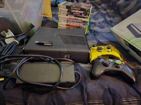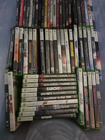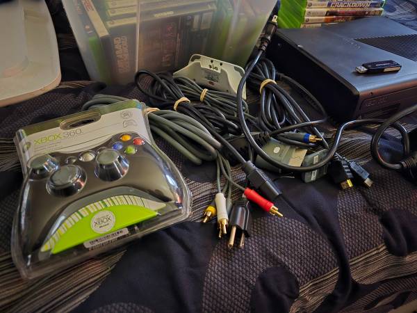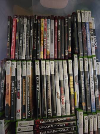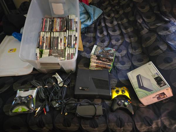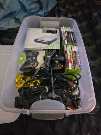 Xbox 360 ! Comes with everything! Brand new controller ..Xbox HDDVD with a bunch of movies ! Over 50 games ...a few are unopened ! Comes with all wires and accessories! Serious inquiries only please! Take whole plastic tote ! Selling all as a bundle !